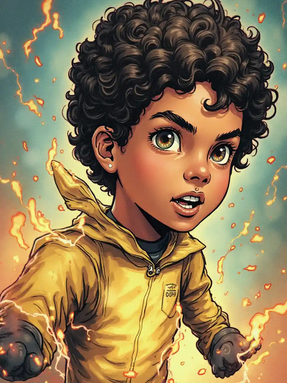Comics aus den 70er Jahren, 10-jähriger Junge mit braunen Locken, heller Haut mit elektrischem Comic-Cover aus den 70er Jahren
