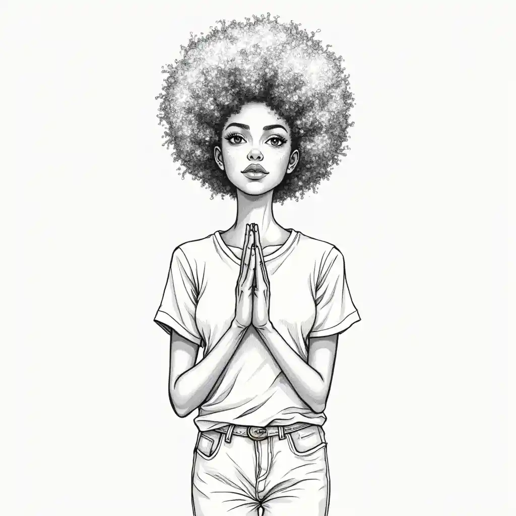 Schwarze schwarze Frau mit 5 Fingern in der Hand, schwarz-weißer, dünner Drahtskizze zum Gebet, T-Shirt und Hose, Hand vorne
