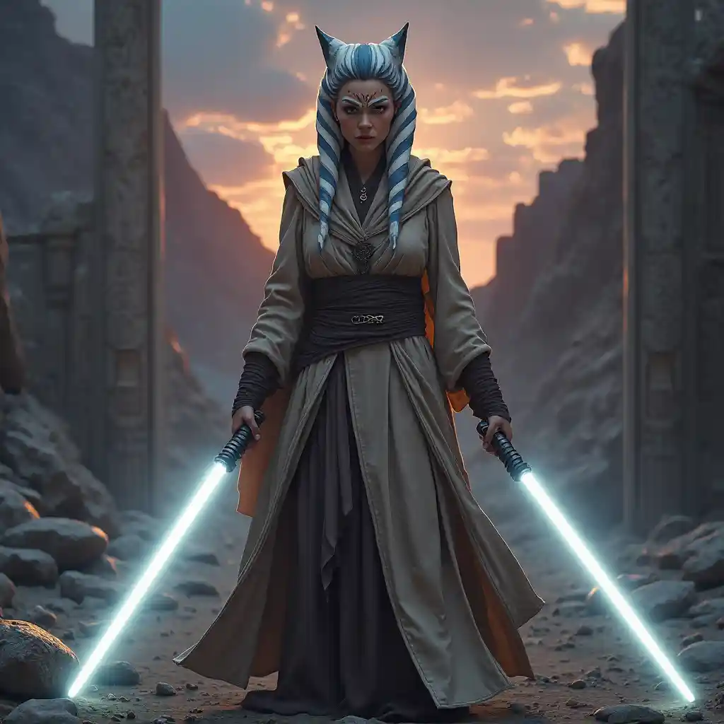 Ahsoka in ihrer reifen Kriegerphase, in wallenden Gewändern, entzündet mit zwei weißen Lichtschwertern. Sie steht am Rande eines zerstörten Jedi-Tempels unter Dämmerungshimmel, hinter ihr schimmert der alte Text. An ihrem Lekku befinden sich feine Narben. Ihr Gesichtsausdruck ist ruhig und böse. Filmischer Star-Wars-Realismus mit starken Kontrasten und Objektivleuchten.