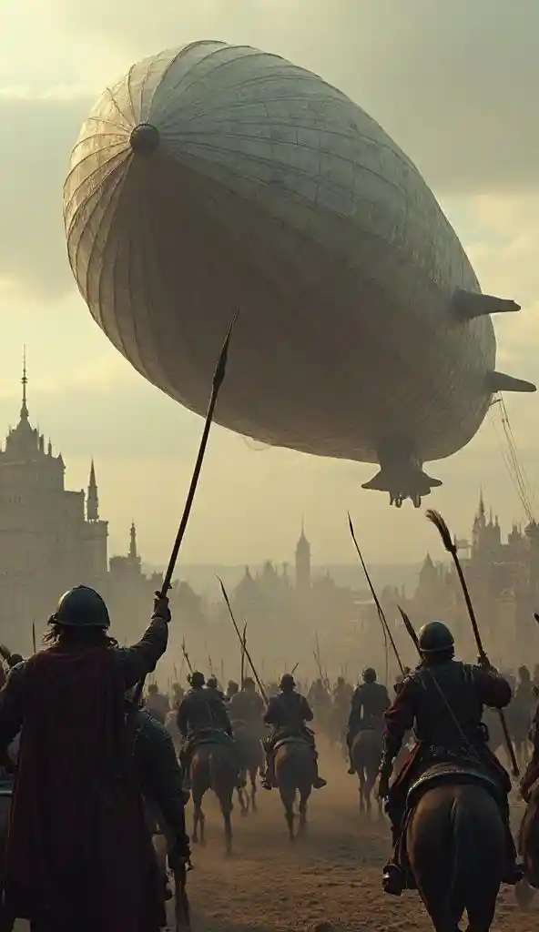 Luftschiff über mittelalterlicher Stadt von Pferdebogenschützen attackiert
