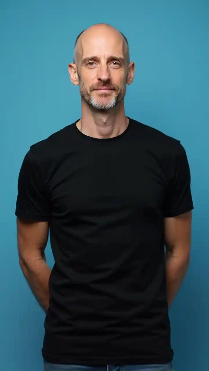 BettyAlbino-Mann mittleren Alters in schwarzem T-Shirt, Quarantäne, blauer Hintergrund, Modell, Simulation