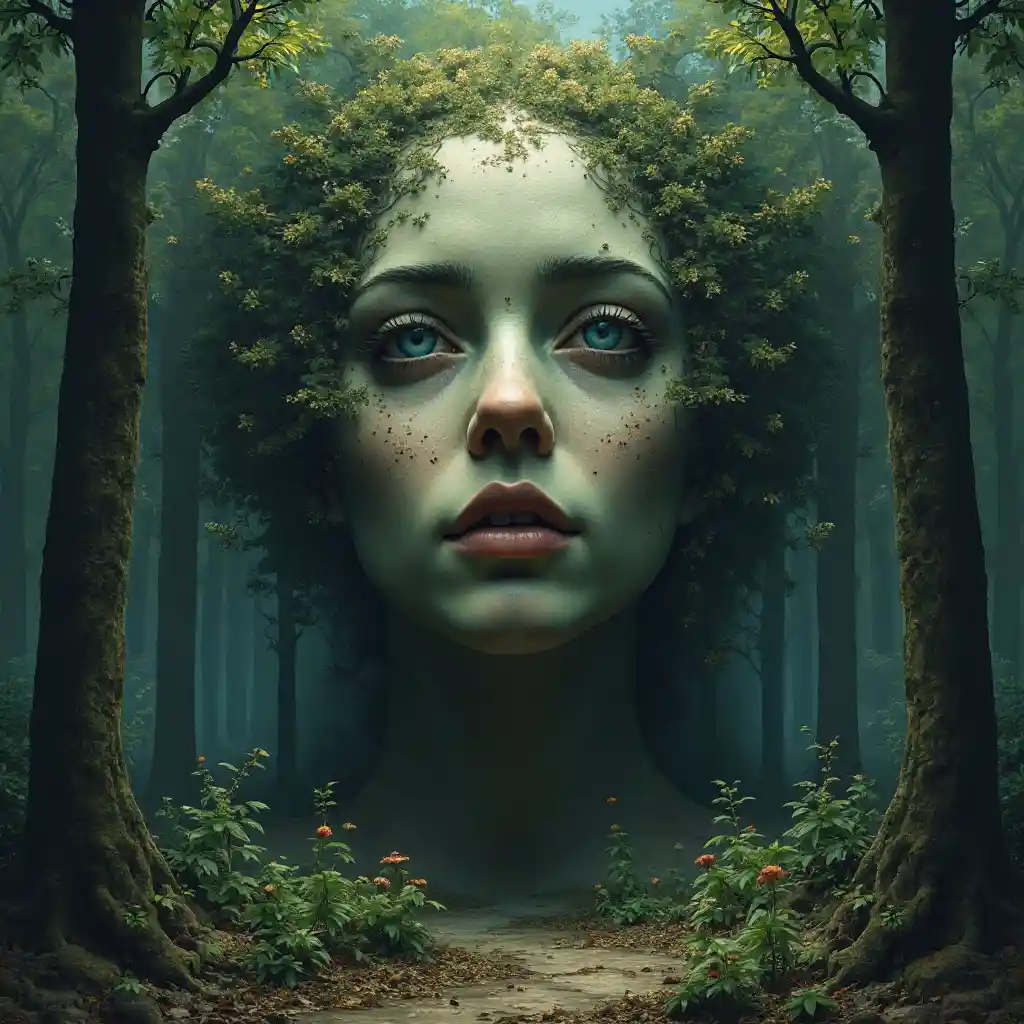 Surreale Fantasy-Kunst: Frauengesichter im Wald