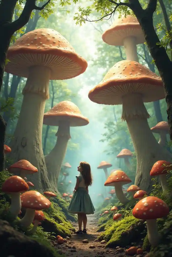 Alice schläft im Wunderland, steht in einem skurrilen Wald mit riesigen, hoch aufragenden und verschiedenen Pilzen und schaut mit Ehrfurcht nach oben