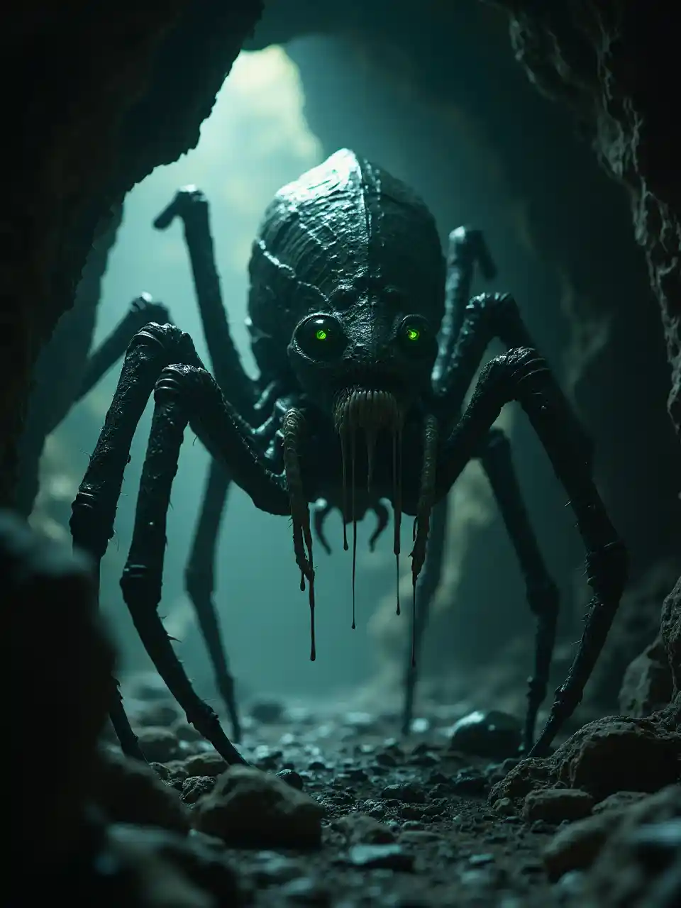Eine gefürchtete außerirdische Einheit, die einer humanoiden Spinne ähnelt, steht ominös am Eingang einer dunklen Höhle, und eine giftige Flüssigkeit, die aus ihrem Mund tropft, speichelt. Seine bedrohlich grünen Augen strahlen tödlich und kräftig und werfen gruselige Spiegelbilder in die schummerige Umgebung. Die Details dieses Lebewesens sind kompliziert und haben ein alptraumhaftes, chitisches Exoskelett, das die subtile Rolle des dramatischen Lichts einfängt. Die realistische Textur hebt jedes Gelenk und jede Gliedmaße hervor und verstärkt sein Präsenzgefühl. Die Szene strahlt hochauflösende Klarheit und stimmungsvolle Geräusche in filmischer Qualität aus, wobei die Mischung aus weltfremder Bedrohung und Realismus im 8k-Filmformat festgehalten wird.