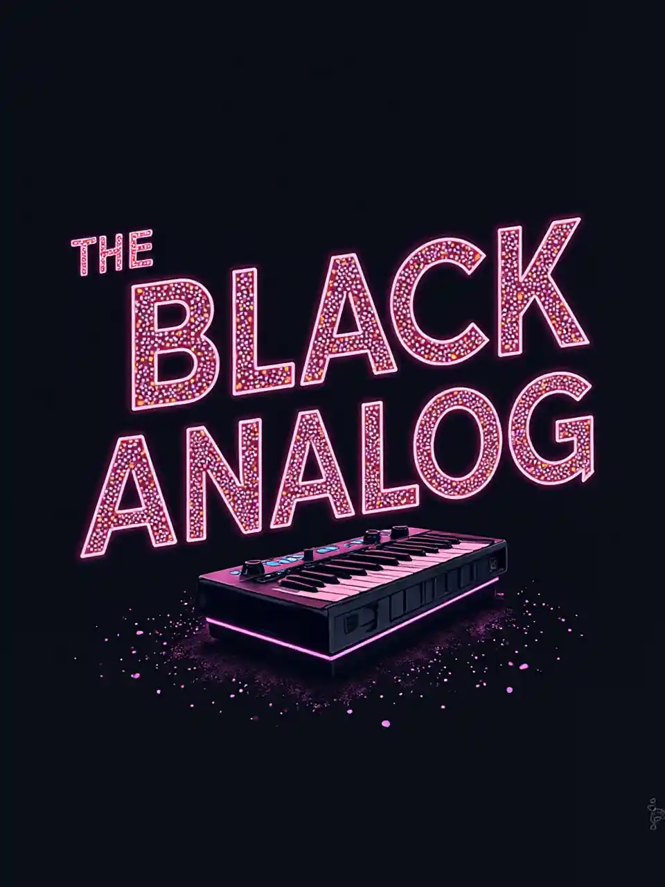 Spinnsynthesizer, Achtzigerjahre-Ästhetik, Neonlichter, glitzernde Diamanten, kühn stilisierte Buchstaben "THE BLACK ANALOG", minimalistisches Design, Omas Schmuckschrank, klare Linien, ultradetaillierte, glatte Optik, in der Typografie Ein stimmiger, sauberer Hintergrund, eine auffällige visuelle Wirkung, die Eleganz mit Einfachheit verbindet, ist ideal für die grafische Darstellung.