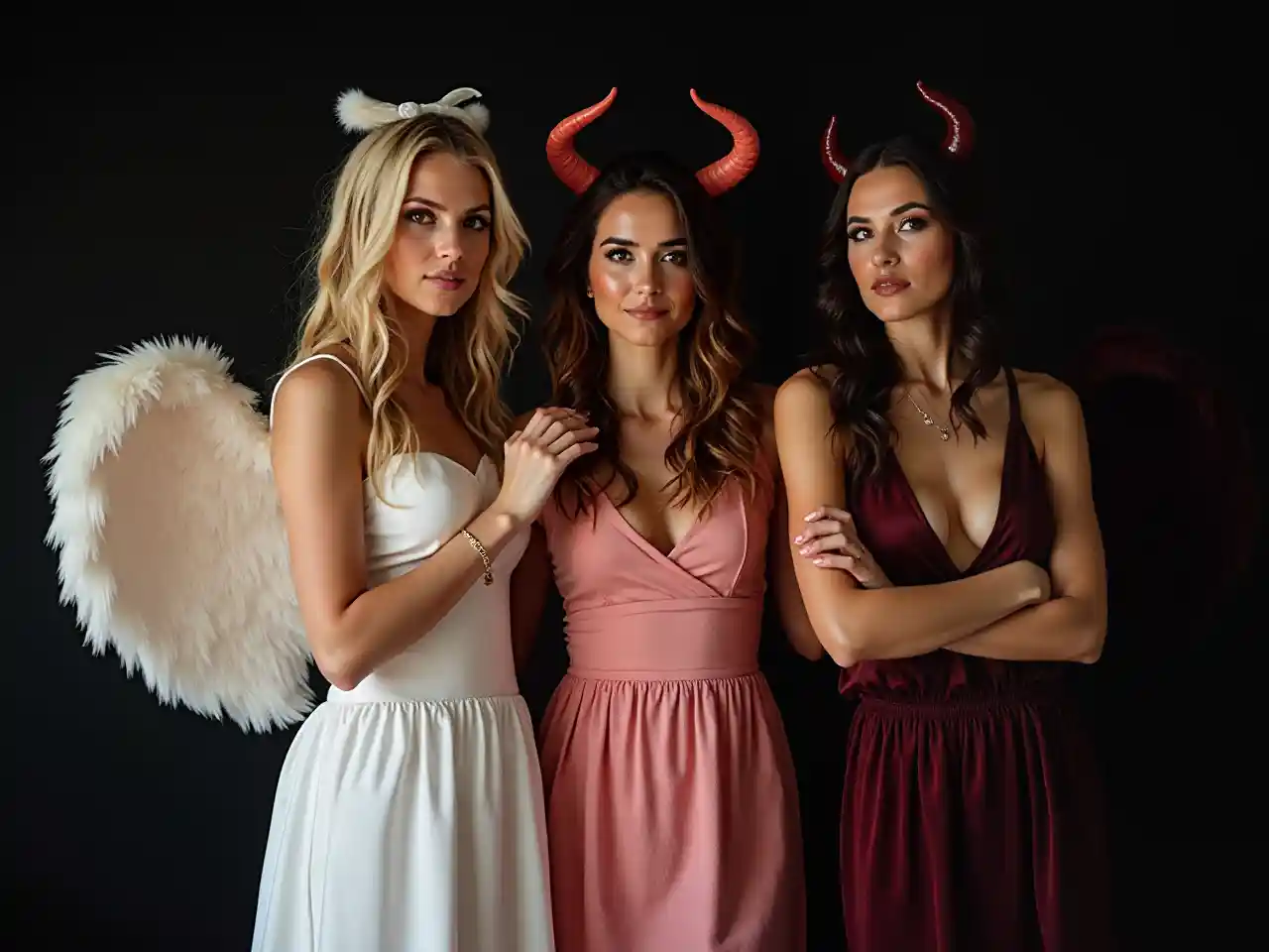 WilliamDrei Frauen in Engels- und Teufelskostümen posieren gemeinsam vor schwarzem Hintergrund.