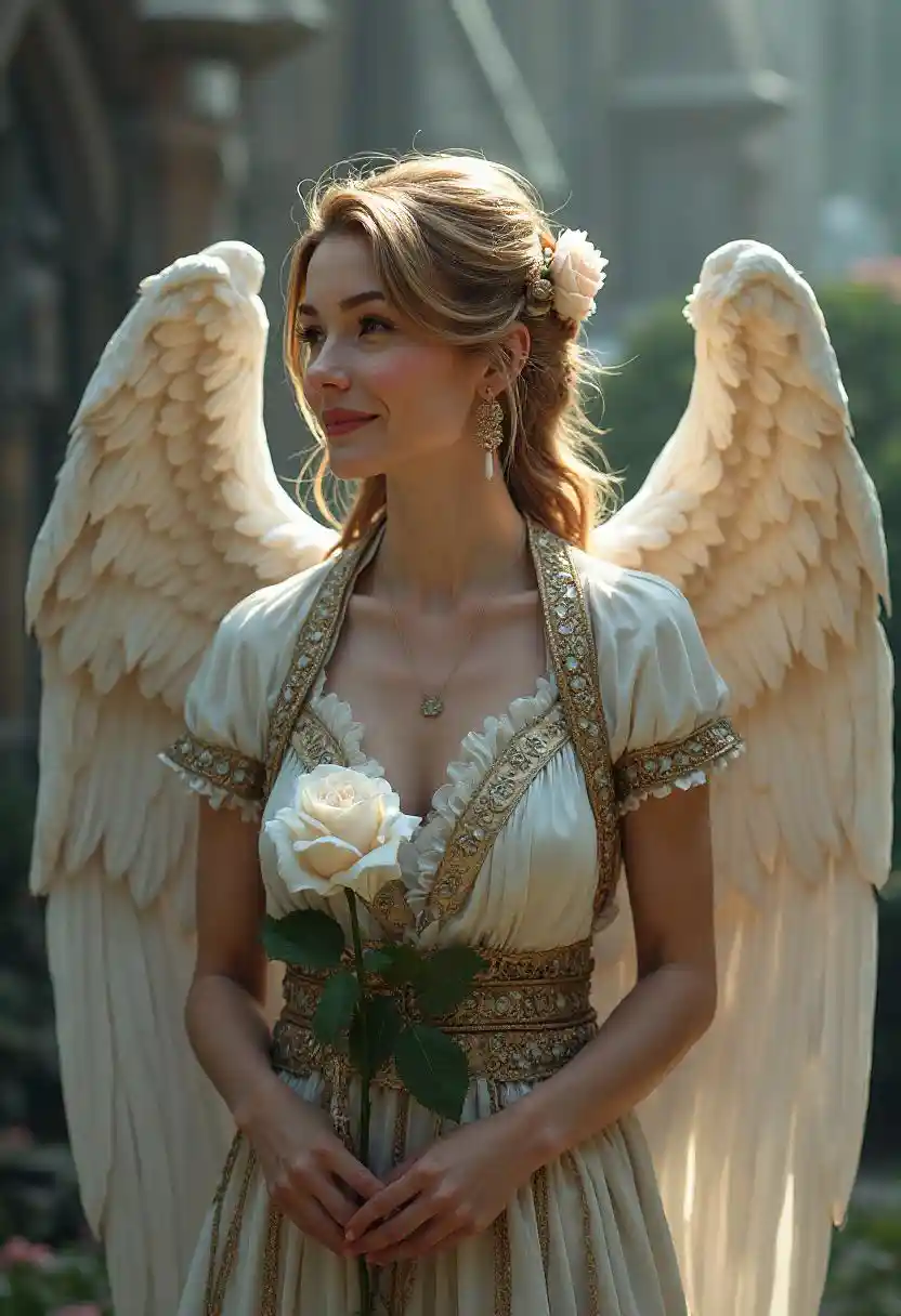 ((Frau, Engel, Erzengelflügel, Ritter, Rosenhaarschmuck, Ohrringe, Lächeln, vor der geheimnisvollen Kirche, mit weißer Rose, Brustumfang nach oben)), masterpi