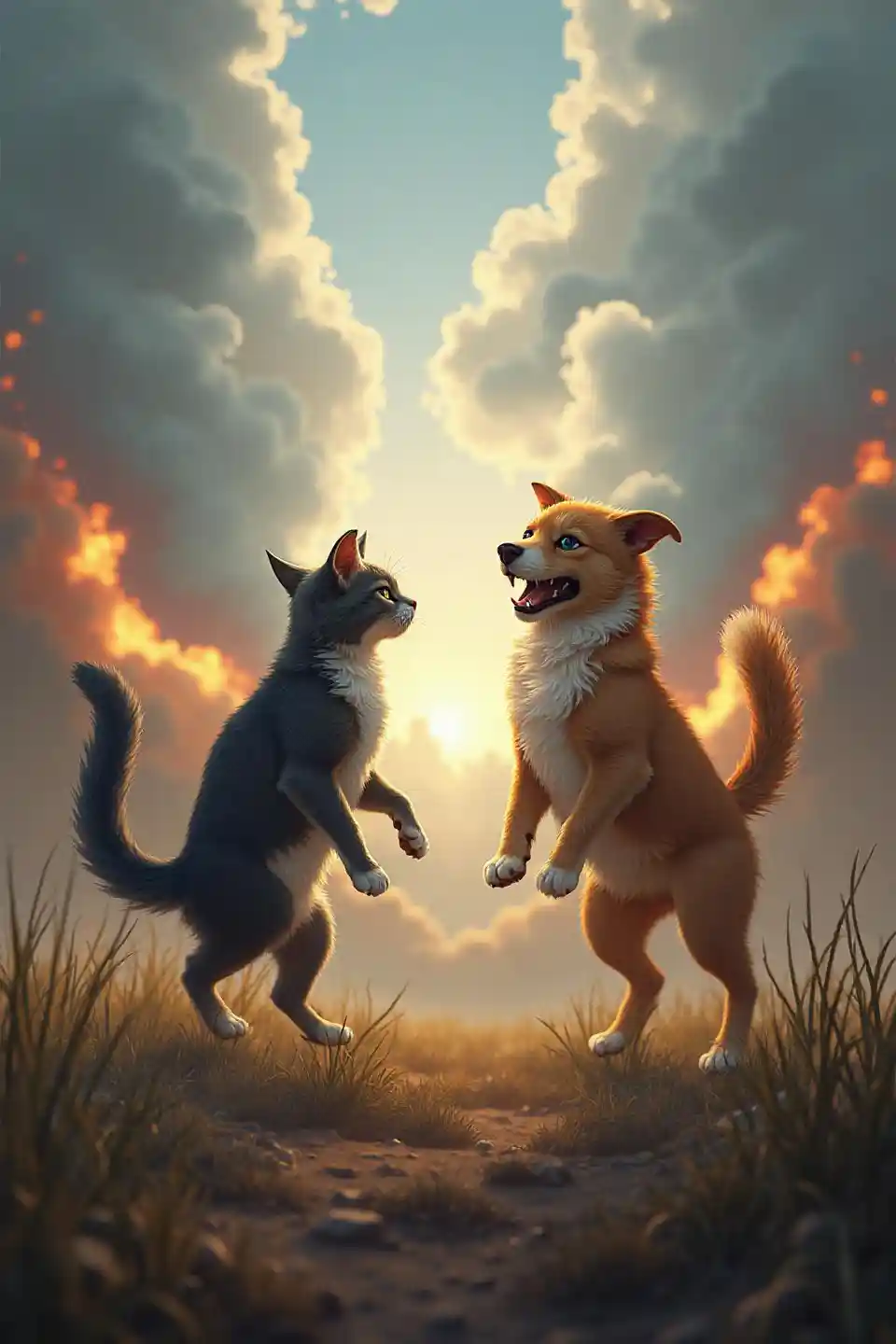 Katzenarmee vs. Hundearmee, trennt Katzen und Hunde und springt auf , Segmentierte Ansicht, Mittellinie, brennendes Schlachtfeld , (Ultra-Detail, beste Qualität, absolute Auflösung: 1,0)
