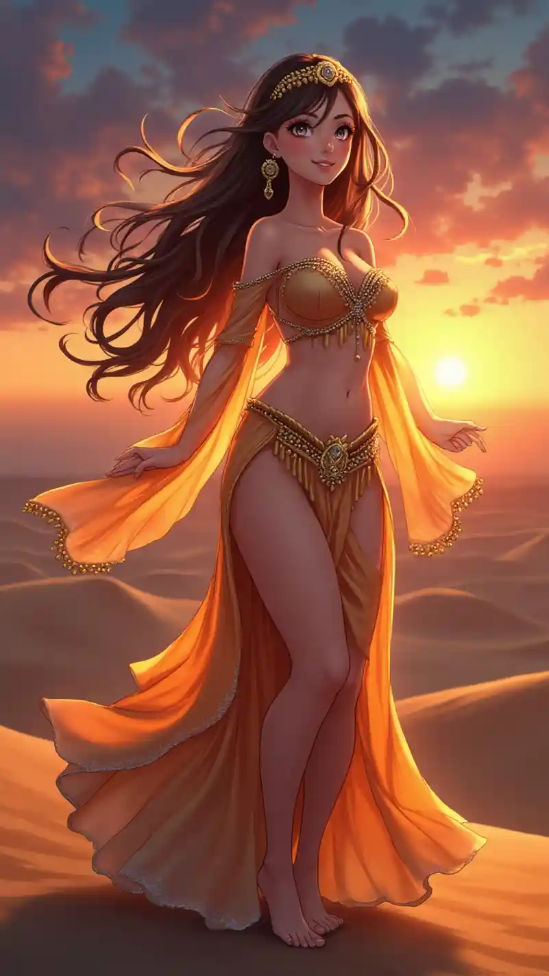 Das vertikale großformatige Ultra-High-Definition-Anime-Mädchen, strahlende Schönheit und Sensibilität, leuchtet in der Dämmerung, steht auf den bunten Wüstendünen im Freien in der untergehenden Sonne, trägt ein fließendes Bauchtanzkleid mit tiefem Ausschnitt und transparentem Schleier, langes Haar Tanz mit dem Wind, warmes Lächeln, große Augen glänzen, Haut leuchtet, warme Gold- und Orangefarbenpalette, elegante Gesichtszüge, perfektes Make-up, exotische und abenteuerliche Atmosphäre, sanftes Licht und natürliches Licht Sie unterstreicht ihre Versuchung, ihre klar konturierte Brust und ihr dezentes Dekolleté sowie ihre langen und durchtrainierten Beine in einer schönen Haltung, die Schönheit und Mysterium ausstrahlt.