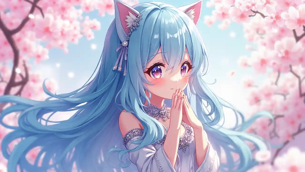 (Anime Girl), (schüchterner Ausdruck), lange blaue Haare, Katzenohren, glitzernde Augen, komplizierte Kleidung mit exquisiten Mustern, weiche Farben, skurrile Atmosphäre, lebendiger Hintergrund voller Kirschblüten, fantastische Einstellungen, ultradetailliertes, charmantes Charakterdesign, belebende Emotionen, hell reflektiertes Licht, magische Atmosphäre, visuell bezaubernde Kunstwerke.