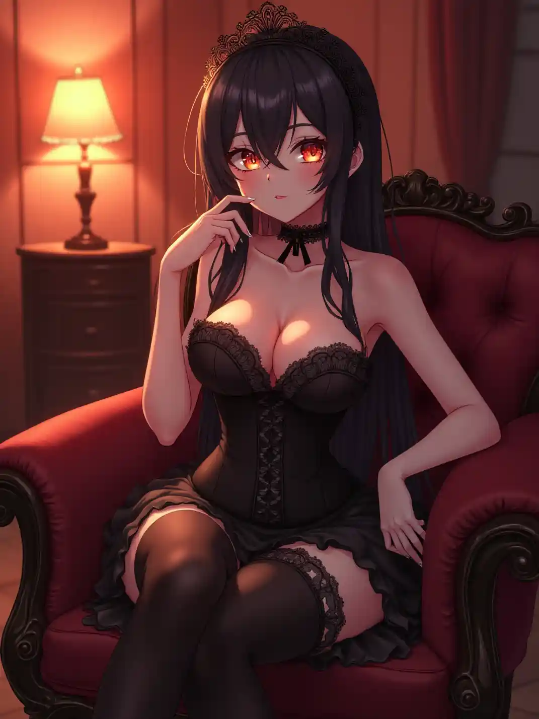 Das vertikal großformatige Ultra-High-Definition-Anime-Mädchen, atemberaubend wunderschön und verführerisch, leuchtet im sanften Kerzenlicht, sitzt im viktorianischen Indoor-Wohnzimmer mit Samtmöbeln, trägt ein gotisches Dienstmädchen-Outfit mit Oberschenkelsocken und Seidenstrümpfen, lange Haare schmücken Spitzenkopfschmuck und ein schwaches Lächeln, große glitzernde Augen, leuchtende Haut, dunkelrote und schwarze Palette, exquisite Gesichtszüge, mutiges Make-up, intime und elegante Atmosphäre, Das warme Licht zeigt ein sanftes Licht, das ihre Versuchung unterstreicht, die klar konturierte Brust und das dezente Dekolleté sowie die langen und durchtrainierten Beine, die Haltung ist ruhig, strahlt Verführbarkeit und Raffinesse aus.