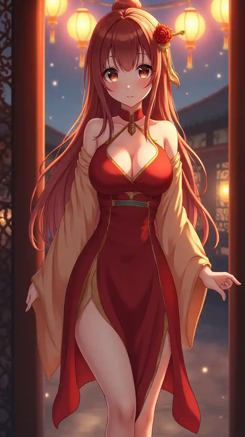 Vertical large-scale image of an Ultra HD anime girl, radiantly beautiful and sensual, illuminated by a lantern’s glow, standing in an indoor traditional Chinese courtyard at night, wearing a revealing hanfu with a deep neckline and sheer sleeves, her long hair adorned with a hair stick and a warm smile, big shimmering eyes, glowing skin, soft red and gold color palette, elegant features, perfect makeup, tranquil and romantic vibes, warm lighting with a soft glow, emphasizing her alluring, well-defined chest with a subtle cleavage, and long, toned legs with a poised posture, radiating charm and elegance.