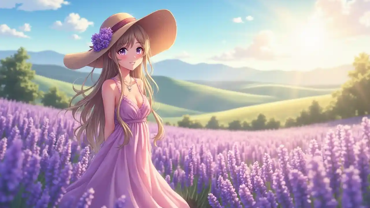 Horizontale großformatige Bilder von Ultra-High-Definition-Anime-Mädchen, bezaubernd und romantisch, in der Sonne sonnen, im sanften Hügel und Outdoor-Lavendelgras stehen, Sommerkleidung tragen, mit tiefem Ausschnitt, breiter Krempe, langes Haar übersät mit Blumen und strahlendem Lächeln, große Augen glänzen, Haut leuchtet, weiche lila-grüne Farbpalette, weiche Gesichtszüge, perfektes Make-up, friedliche und romantische Atmosphäre, sanftes Glanz und natürliches Licht, Sie unterstreicht ihre charmante, gut konturierte Brust und ihr dezentes Dekolleté sowie ihre langen und durchtrainierten Beine mit eleganter Geste, die Schönheit und Charme ausstrahlen.