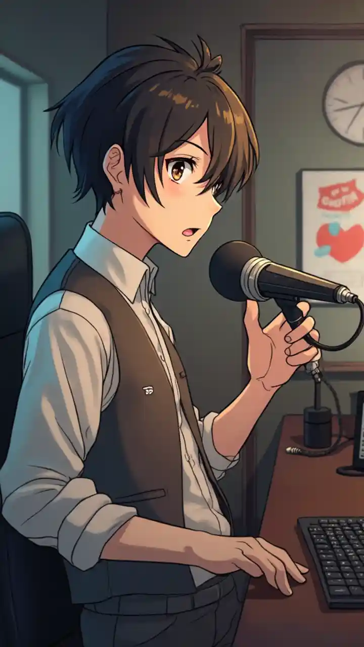 MiaGroßer, gutaussehender junger Mann spielt in einem Anime einen Funkjockey und spricht ins Mikrofon