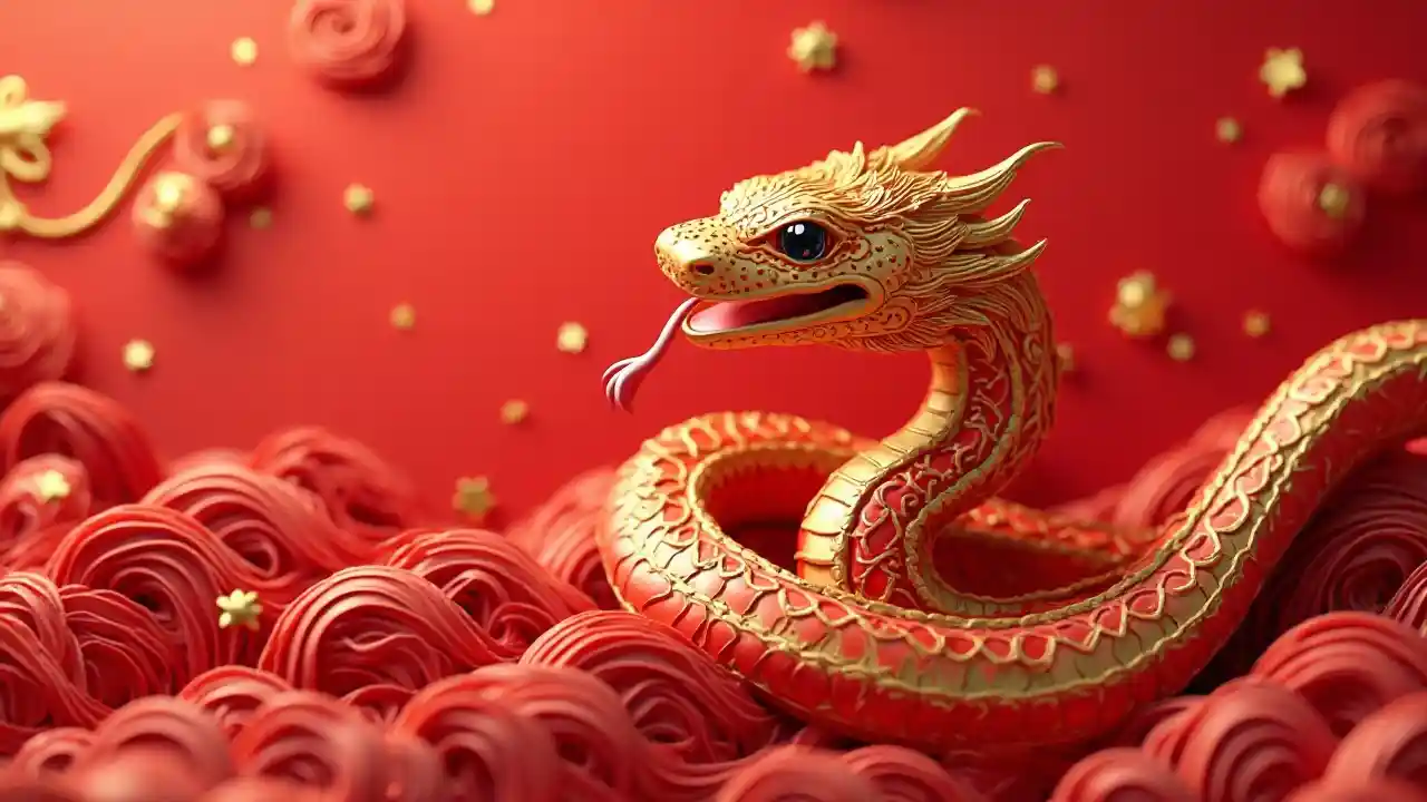 Niedlicher Anime glänzend goldenes Rot mit Farbe und Schlange, vorherrschendes Quilling-Papier, papierähnliches mattes Finish, ultrarealistische 3D-geschichtete Papierstruktur und aufwendige Details, wohlhabender Hintergrund im chinesischen Stil, Segen, scharfe Farben