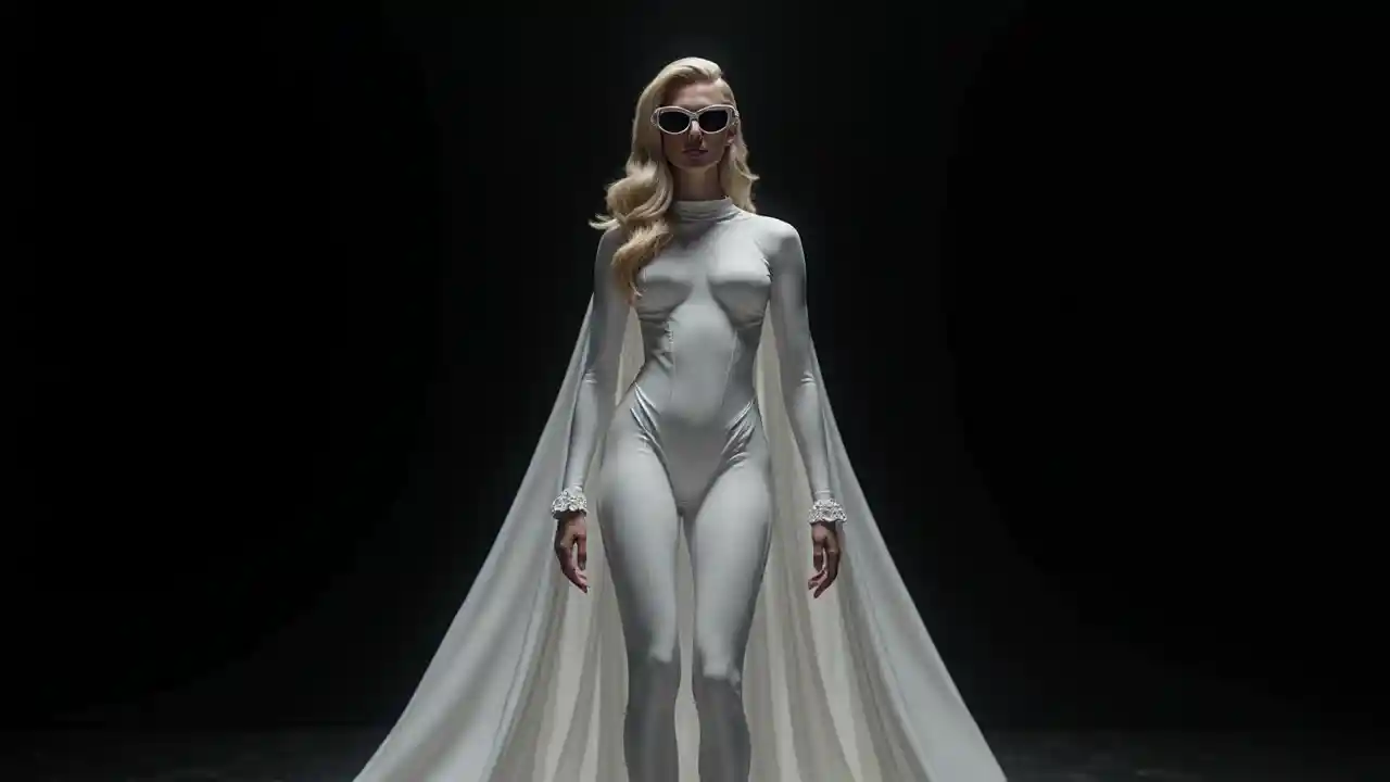 Anna Wintour, Luxus-weißer Kristallanzug mit XXL-Sonnenbrille, einzigartig, schwarzer Hintergrund, komplette Figur, Kopf, Arme, Beine, Musikvideo, Ultra-Reality, 4k, 8k, Ultra-Grafik, Full HD