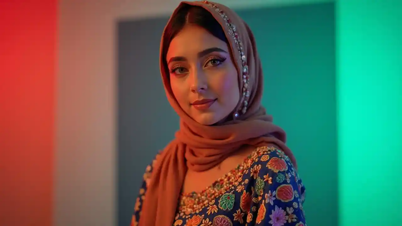 Erstellen Sie ein hyperrealistisches Foto, das eine 20-jährige arabische Frau mit grünen Augen, Kopftuch und einem energiegeladenen Kleid mit detailreichen Stickereien und Schmuck zeigt. Lächelnd stehen die Fotografen im bunt beleuchteten Studio und posieren dynamisch und selbstbewusst. Der Hintergrund ist bunt und passt perfekt zum Outfit des Motivs, die Fotos sind klar fokussiert und hochauflösend. Haut und Augen der Fotografen werden mit exquisiten Details wiedergegeben, und der warme und attraktive Ausdruck strahlt Eleganz und Eleganz aus