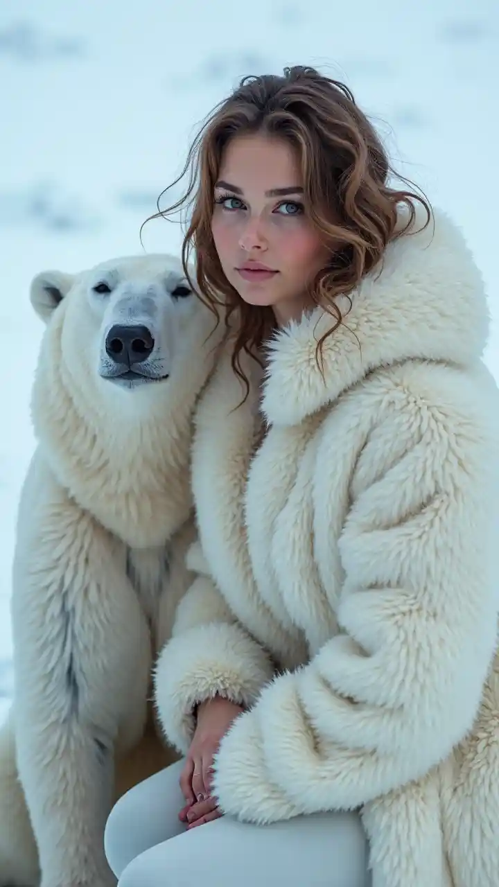 PaisleyDas Porträt der jungen Frau sitzend, in die Kamera schaut, trägt einen dicken weißen Pelzmantel, der Eisbär sitzt daneben, Polarlage, Eis und Schnee, kalte Umgebung, hohe Detailtreue