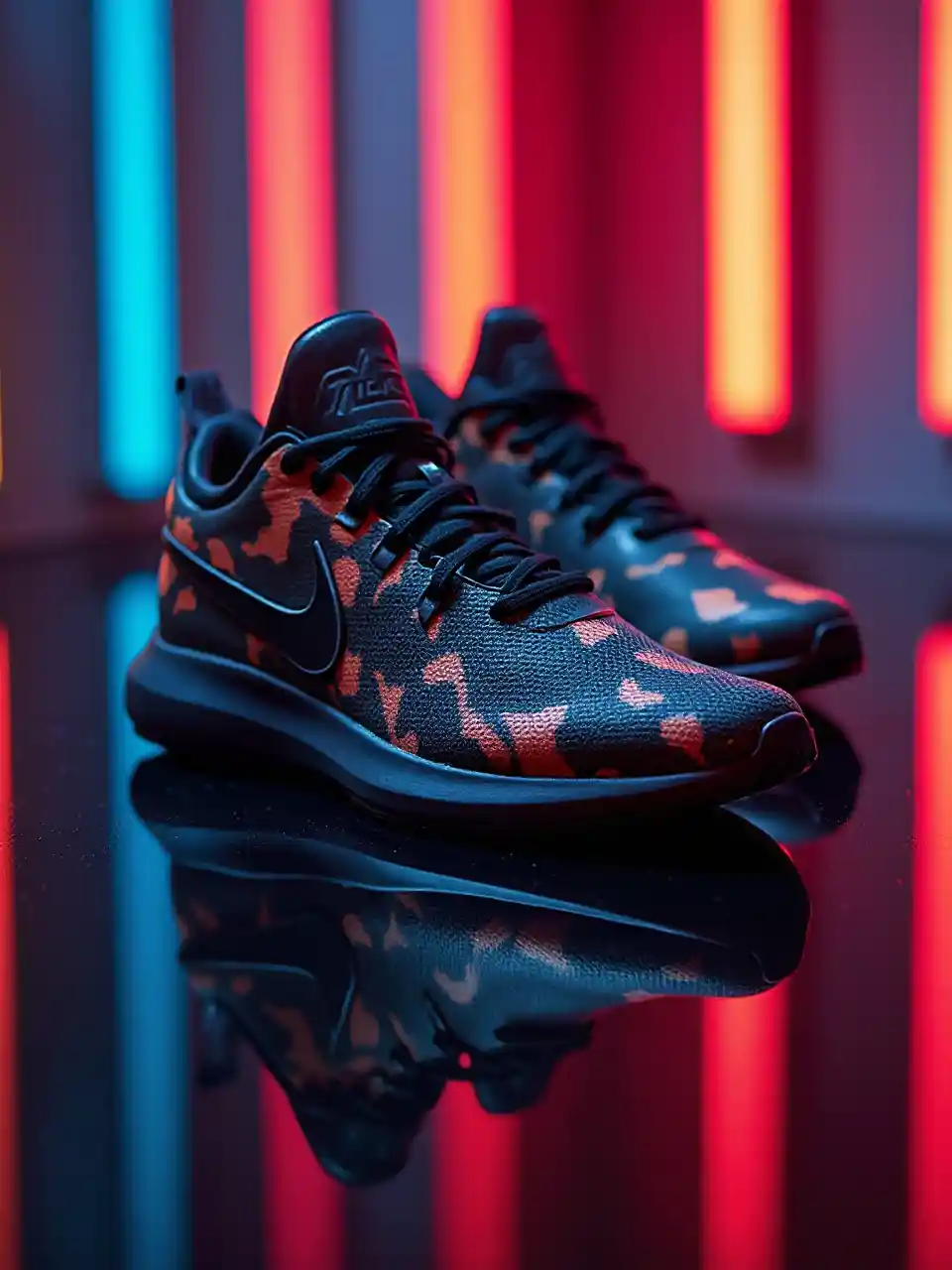Ein Kunstfoto, das das Wesen der Produktivität festhält, ein Paar abgerundete Nike-Sneaker mit dynamischem Camouflage-Muster. Die Schuhe bilden einen eleganten Kontrast zur glänzenden schwarzen Oberfläche und erzeugen eine spektakuläre Reflexion, die ihr Design aufwertet. Die Szene wird von lebendigen Neonlichtern angestrahlt und verleiht der Komposition eine pulsierende Moderne.