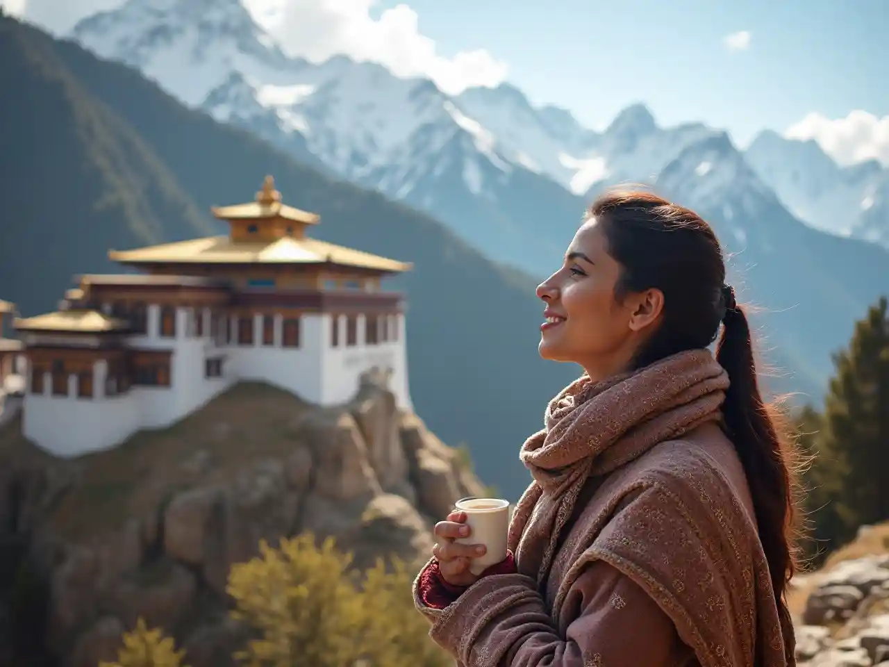 In der atemberaubenden Höhenlandschaft von Arunachal Pradesh steht eine wunderschöne Inderin ehrfürchtig am Rande von Dawang, wo die schneebedeckten Gipfel die antike Stadt in ihren majestätischen Armen wiegen. In einem warmen traditionellen Schal mit dezenten Stickereien starrte sie auf den berühmten Dawang-Tempel - sein goldenes Dach glitzerte in der sanften Sonne wie eine spirituelle Krone, die sich an den Himalaya schmiegt. Im knackigen Bergwind weht die Gebetsfahne. Während sie den heißen Buttertee schlürfte, ging die Dame langsam durch den alten Stupa, der rotierende Gebetsrohr war still respektiert und ihr Gesicht war von tiefer Überraschung und Ruhe erfüllt. Um sie herum entfaltet sich die Landschaft zu sanften grünen Tälern, kristallklaren Flüssen und ruhigen Bergseen, die den weiten Himmel darüber widerspiegeln. Ihre Augen leuchten auf Schritt und Tritt – sei es der bunte Basar voller versteckter Utensilien, der sanfte Yak, der an der Bergstraße grätet, oder die Freundlichkeit in den Augen der Einheimischen.