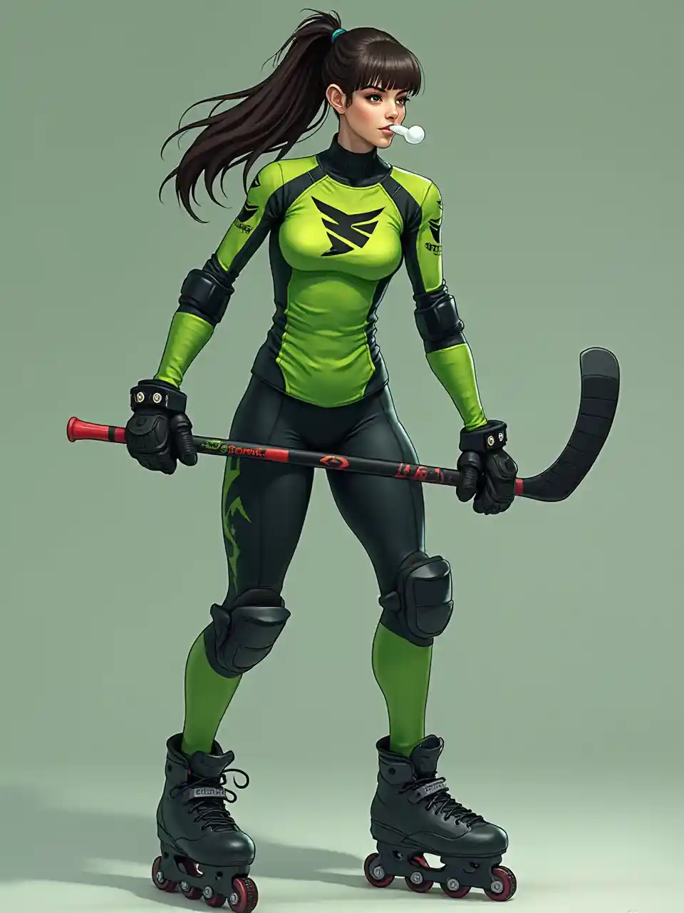 Der Superschurke. Weibliche Frauen, weiße Frauen. Sportbegeisterte, vor allem Roller Derby und Hockey. Athleten. Groß, robust, fit, wendig, geschickt. Gut aussehende Frau. Lange, dunkelbraune Haare, nach hinten zu einem hohen Pferdeschwanz gezogen, Pony im Mittelfeld. Sie trägt kein Make-up, sondern nur ein bisschen Kirsche ChapStick. Hellbraune Augen, oft versteckt hinter einer grünen Schutzbrille/Sonnenschild. Langärmeliges Spandex-Sweatshirt mit Flammenkometensymbol auf der Vorderseite. Das Shirt wird von leuchtendem Grün mit schwarzem Schnittmuster dominiert. Schwarz, kleine Schulterpolster und Ellenbogen zum Sportschutz. Schwarze Sportstrumpfhose, überwiegend grün, mit schwarzem Schnittmuster. Schwarzer Knieschoner, schwarze Schienenbeinschoner. An den Füßen trägt sie schwarz-grüne Rollschuhe, als Waffe der Wahl hat sie meist einen Hockeyschläger dabei. Oft ist sie zu sehen, wie sie Kaugummi kaut, Blasen bläst und nervt, indem sie ihren Kaugummi zertrümmert. Ganzkörper-Pose, vermutlich Rollschuhlaufen.