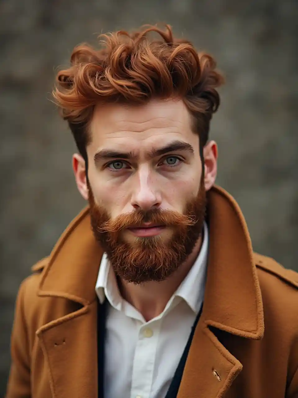 Mann mit rotbraunem Haar und Bart im Karamellmantel