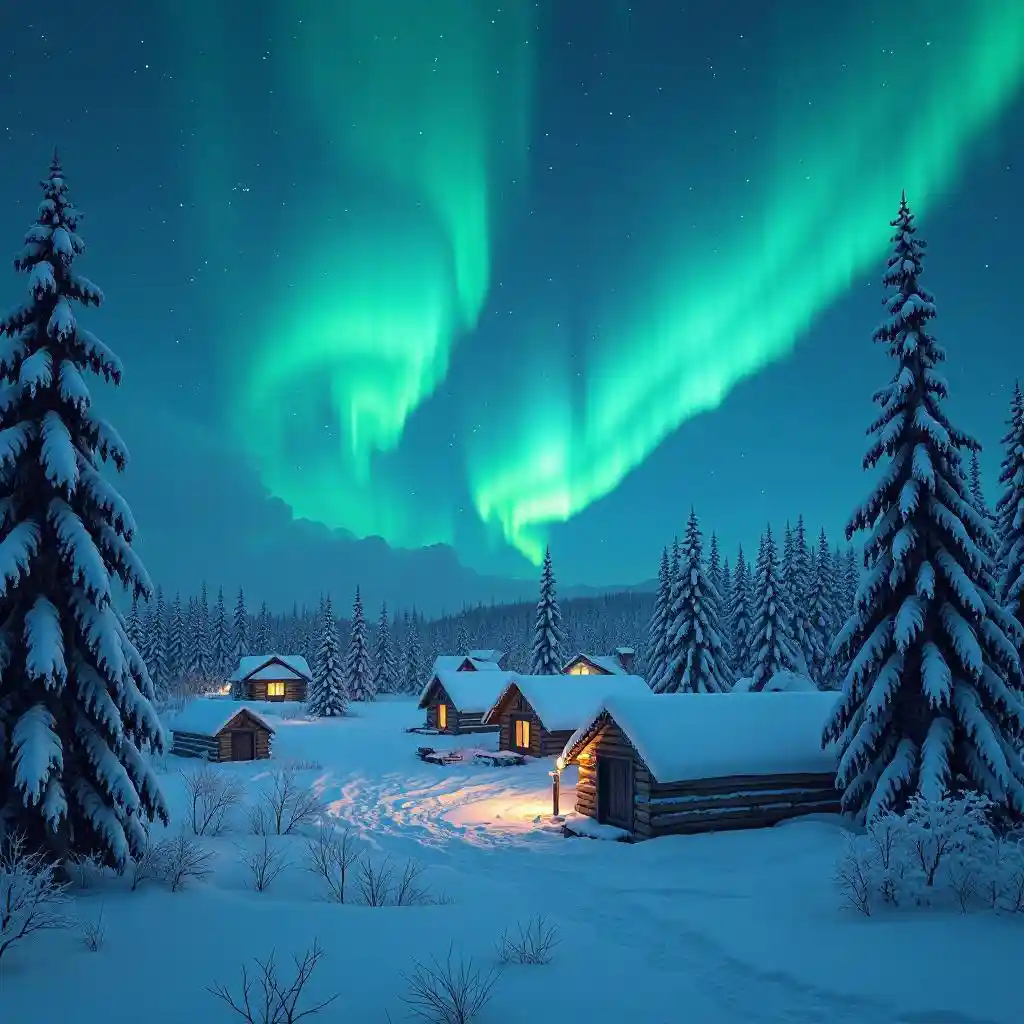 BettyDörfer in der Arktis, Polarlichter erhellen Iglus und Schneekiefern.