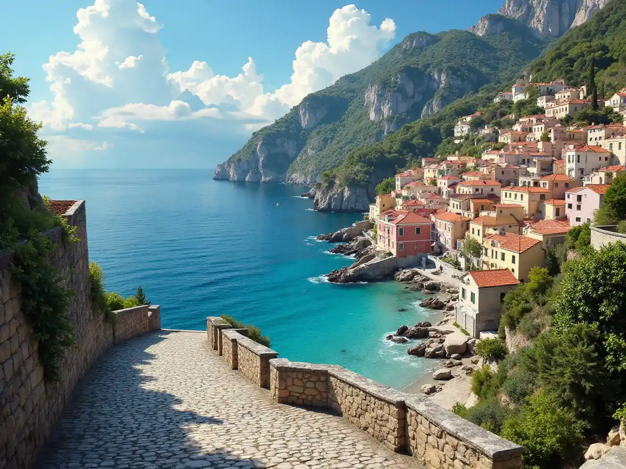 EvelynDie malerische und romantische Landschaft, die Kopfsteinstraße führt zur großen blauen Küste, und ein kleiner Fluss fließt auf die gegenüberliegende Seite hinein.