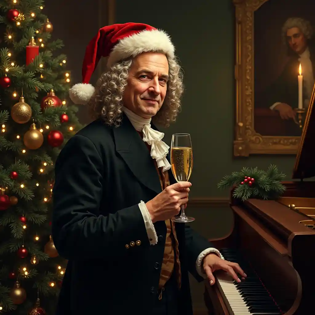 Johann Sebastian Bach steht mit einem Glas Champagner und einem Weihnachtshut an einem Weihnachtsbaum, der mit Weihnachtsbeleuchtung und Accessoires geschmückt ist, lächelt, hat lange Haare und trägt einen schwarzen Anzug, Kerzen an der Wand, Details Gesichtszüge, Ölgemälde, warme Töne, Barock, klassische Musik-Atmosphäre, hochwertige, klassische, detaillierte Klaviertasten, schwarze Anzüge, Geschichte, Tradition, sanfte Beleuchtung, fokussierter Ausdruck, stimmungsvolle Beleuchtung