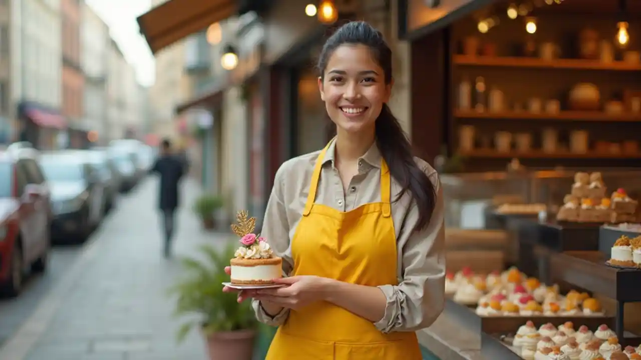 Eine hochgewachsene junge Frau geht auf der Straße, detaillierte Kleidung, realistisch und natürliches Licht. "Eine indische Frau mittleren Alters, Anfang 30, mit langen schwarzen Haaren auf dem Rücken, trägt eine leuchtend gelbe Schürze und hält eine wunderschön verzierte Torte in der Hand. Sie lächelt warm und steht in der gemütlichen Bäckerei, mit Kuchen und Backwaren im Rücken. "