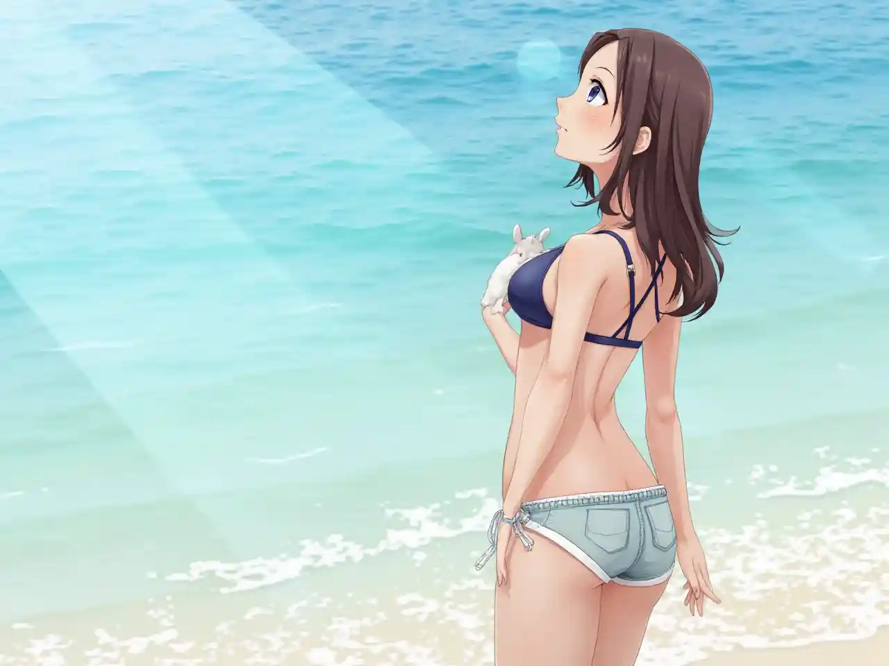 Stilisierte Figuren am Strand in Bikini-Tops und Shorts.