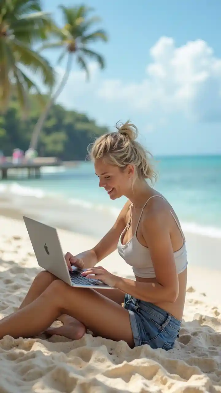 PaisleyFröhliches junges blondes Mädchen, ein digitaler Nomad auf der Insel Phangan, mit Macbook am Strand