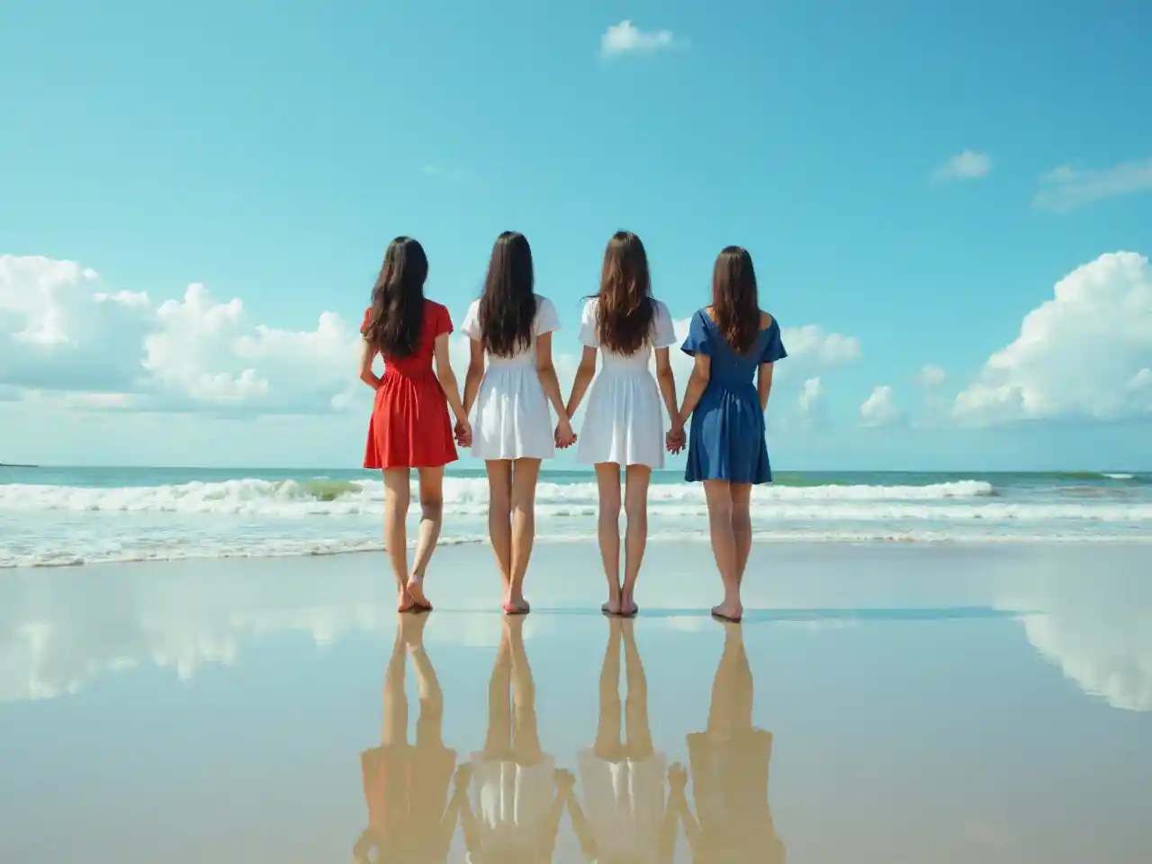 Vier Frauen in Minikleidern standen am Strand im Kreis, posierten Händchen haltend für Fotos und schufen eine schöne und friedliche Atmosphäre mit dem kreisförmigen Spiegelbild um das Wasser, das sich auf das Bild konzentrierte. Die Frauen standen in der Mitte des Bildes, die Frau links in einem roten Kleid, die Frau in der Mitte in einem weißen Kleid und die anderen beiden Frauen rechts in einem blauen Kleid. Die vier Frauen hatten alle dunkle, lange Haare und waren in dieselbe Richtung ausgerichtet, Die beiden legen sich den Arm um die Schultern. Der Himmel über ihren Köpfen ist ein klares Blau mit flauschigen weißen Wolken darüber, während die Wasseroberfläche darunter den blauen Himmel und die weibliche Reflexion widerspiegelt. Der Gesamteffekt ist ein atemberaubendes und faszinierendes Bild, das die Schönheit der Natur und die Verbindung der Frauen in den Bildern zeigt.