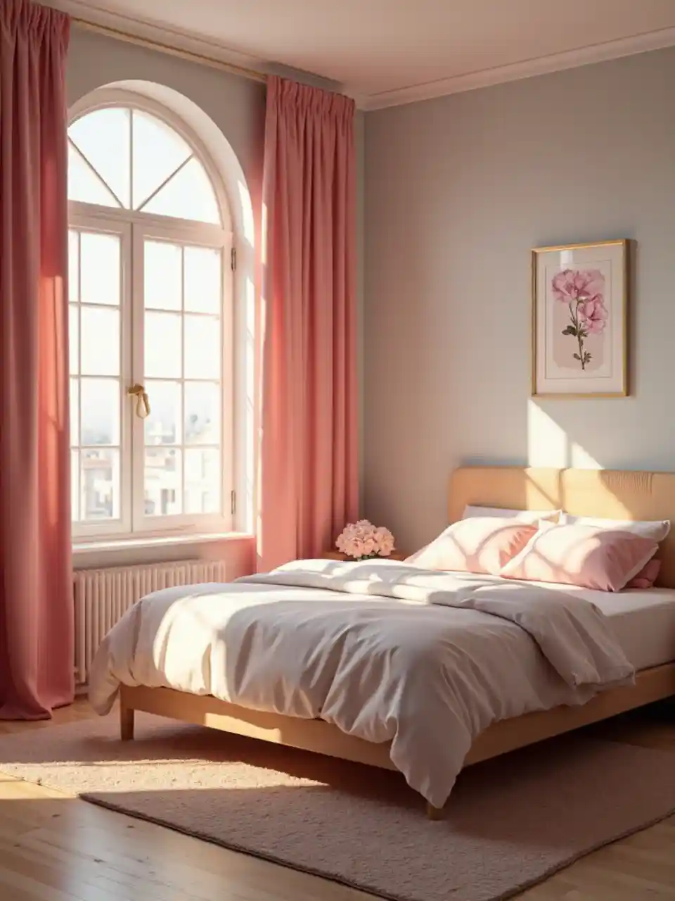 PianeerRealistisches Schlafzimmer mit einem Bett, rosa Vorhänge, Sonnenlicht scheint durch die Fenster