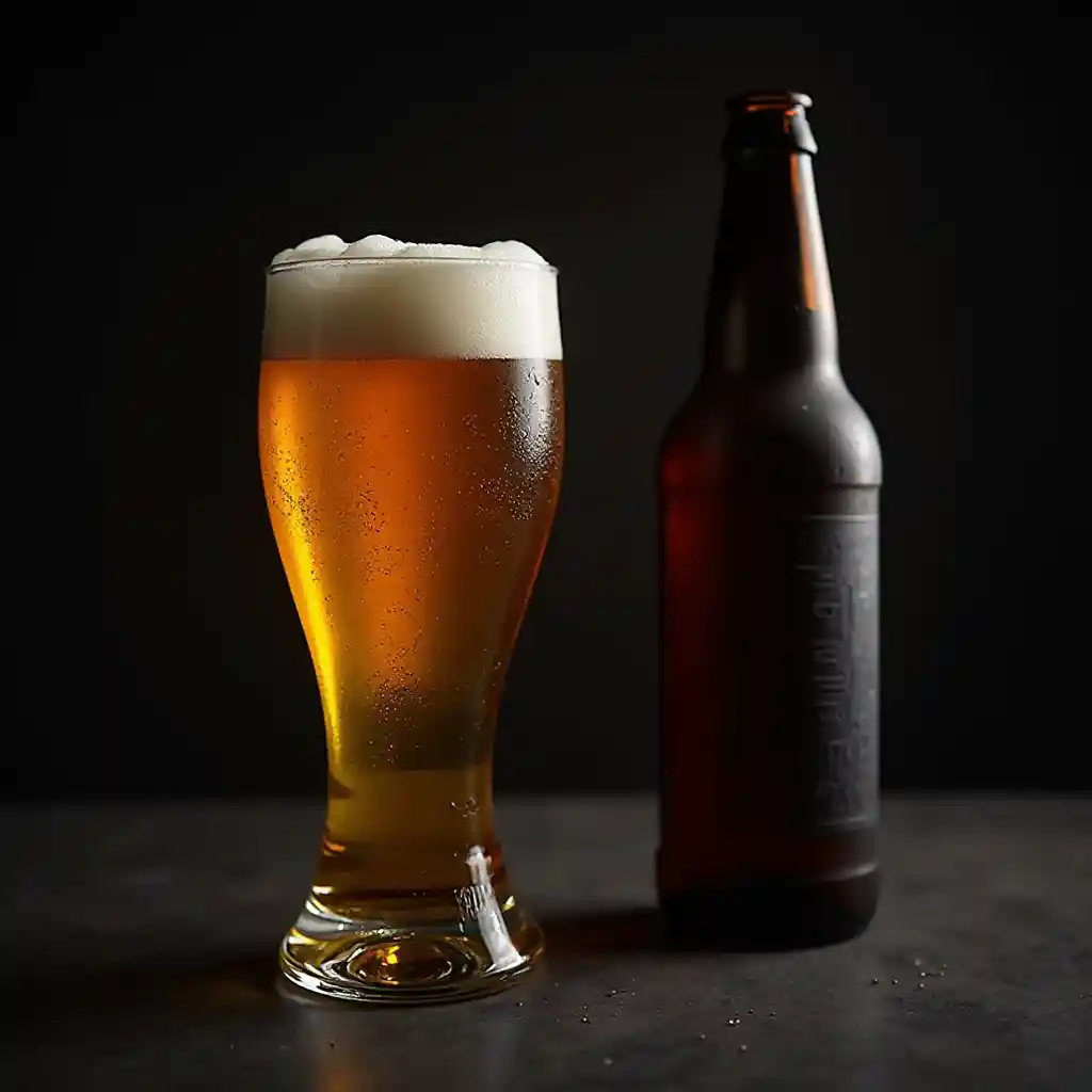 Bierflasche hinter Bierkrug vorne, dunkle Atmosphäre