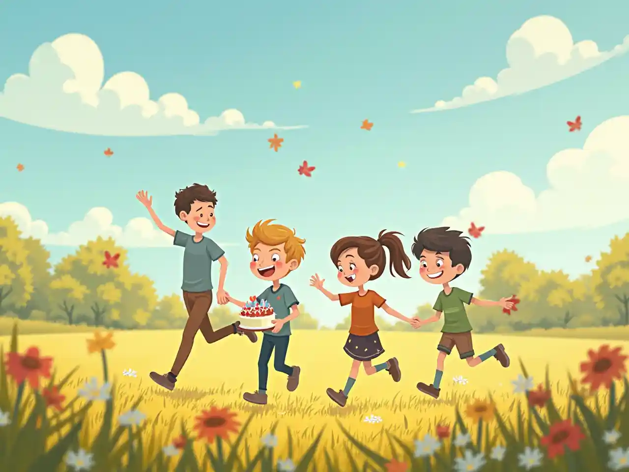 Jungs feiern Julias Geburtstag mit fröhlichen Cartoons