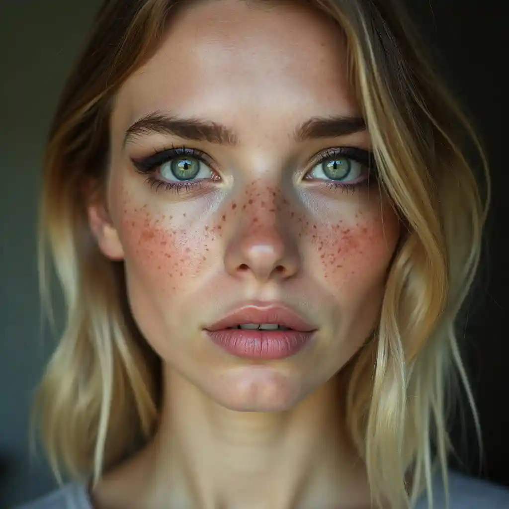 Menschliche junge Frau, 20-25 Jahre alt, leuchtend grüne Augen; starkes Make-up rund um die Augen, schulterlange blonde Haare, Sommersprossen am Spalier, helle Haut