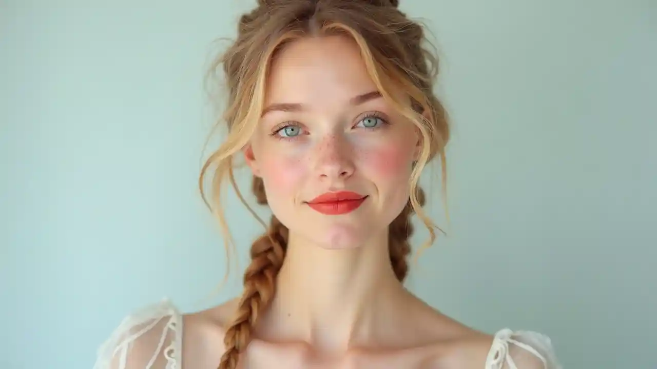 Modemagazin-Cover: niedliches Modell-Foto, weiche Gesichtszüge, rosige Wangen, goldenes Haar, blaue Augen, jugendliche Gesichtszüge, leuchtend rote Lippen, leichte Sommerkleidung, hohe Auflösung, 4K, Studiofotografie, Isolationsmodell,