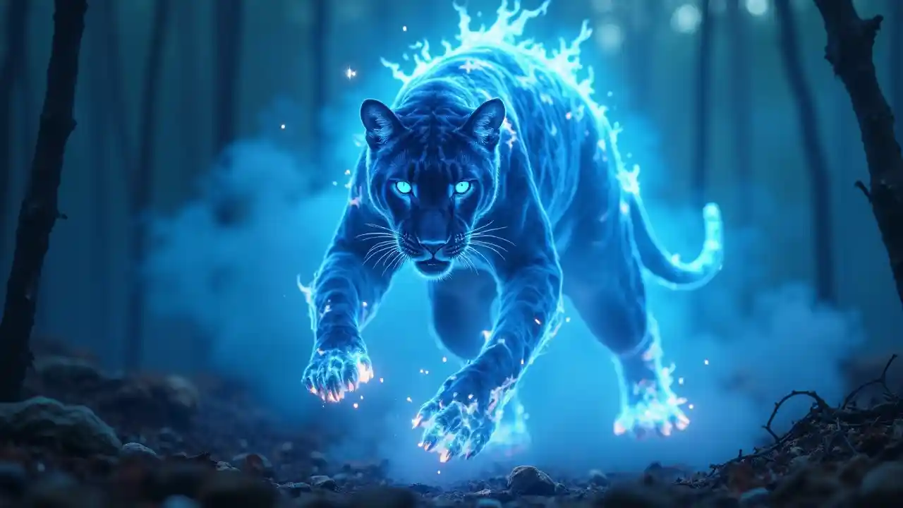 Ein schwarzer Panther in faszinierende blaue Flammen und Rauch gehüllt