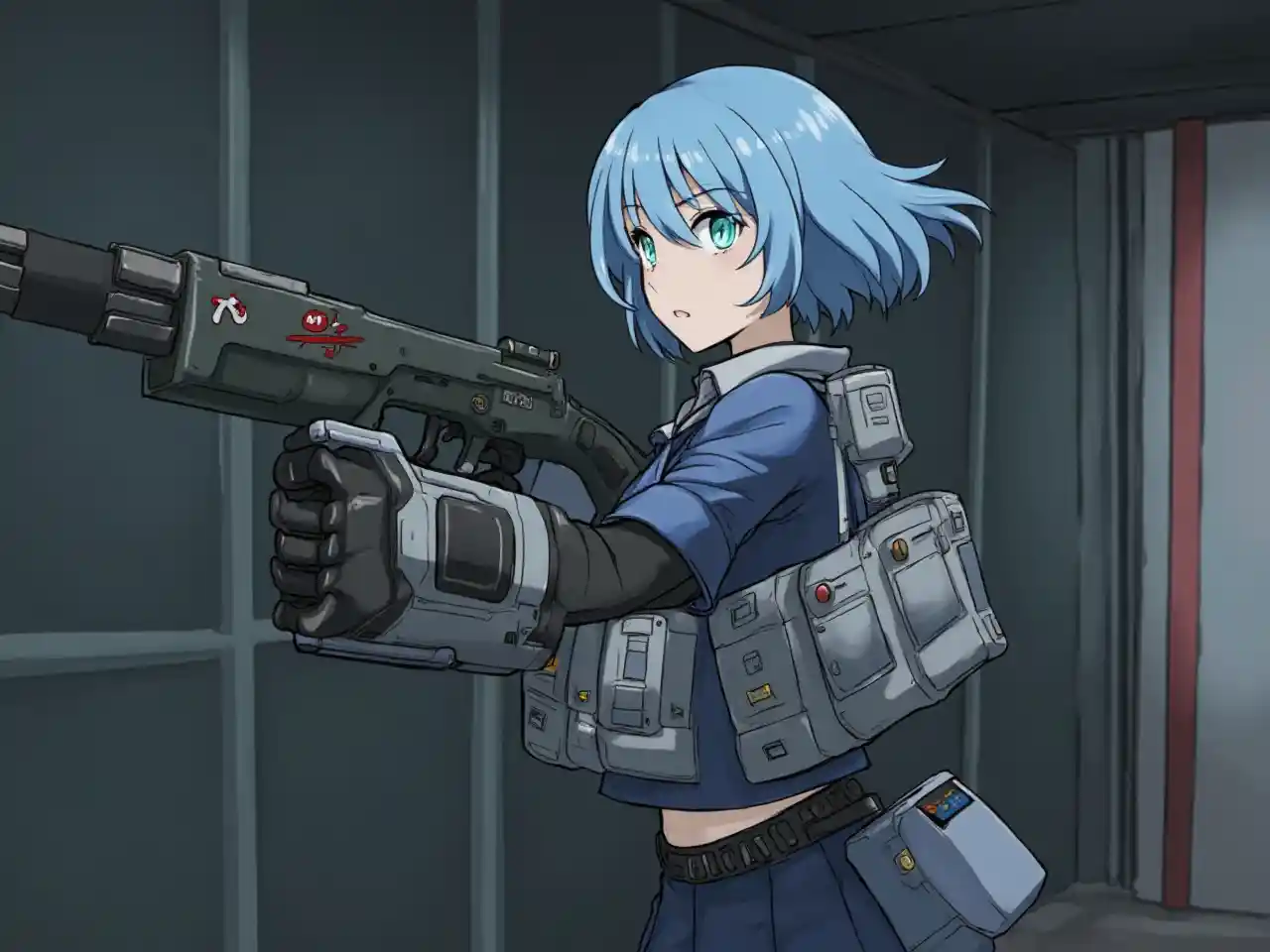 Mädchen, hellblaue Haare, mit Waffe, Roboterarm, Soldat, Untergrund, kurze Haare