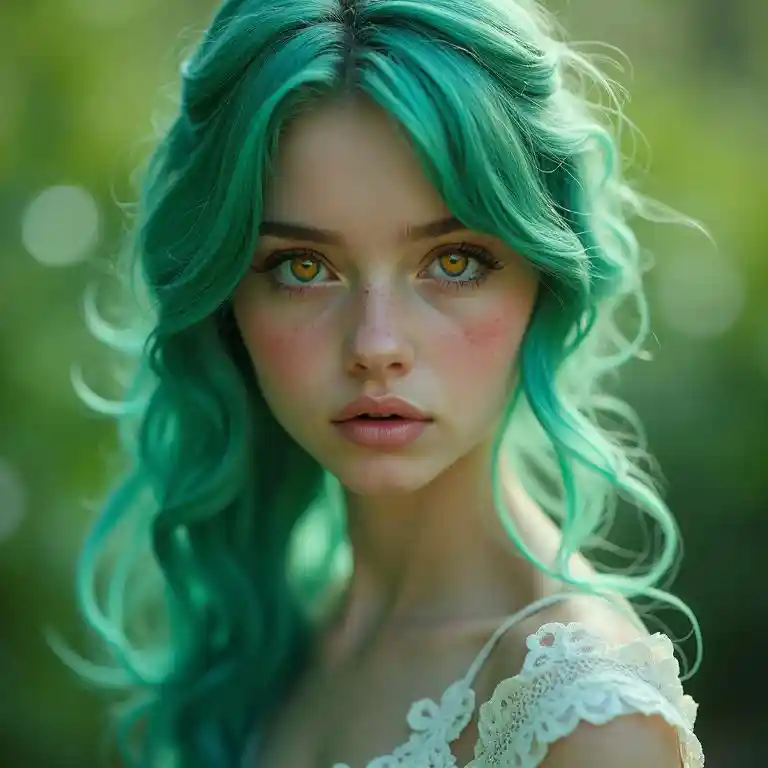 Schönes Mädchen, grünes Haar, rote Augen, Erzengel, Blaurose-Pfad, 4K, hochwertig, authentisch, realistisch, professionell, wunderschön, Bokeh, HDR, exquisites Licht, farbenfroh, exquisites Colo