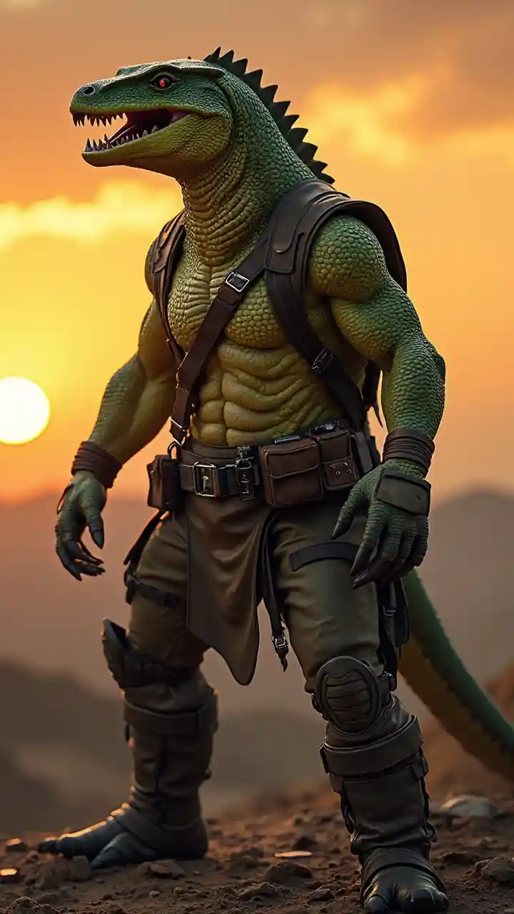 Bossk, ein wilder Reptilien-Kopfgeldjäger, aufrecht und stabil, dynamische Haltung, grüne und gelbe Schuppen, scharfe Zähne, in rauem Leder mit praktischem Gürtel, stimmungsvoller Hintergrund der Science-Fiction-Landschaft, lebendig Die Farbe zeigt den Sonnenuntergang, hohe Kontrast, filmähnliche Tiefe, ultradetailliert, 4K-Bildqualität.