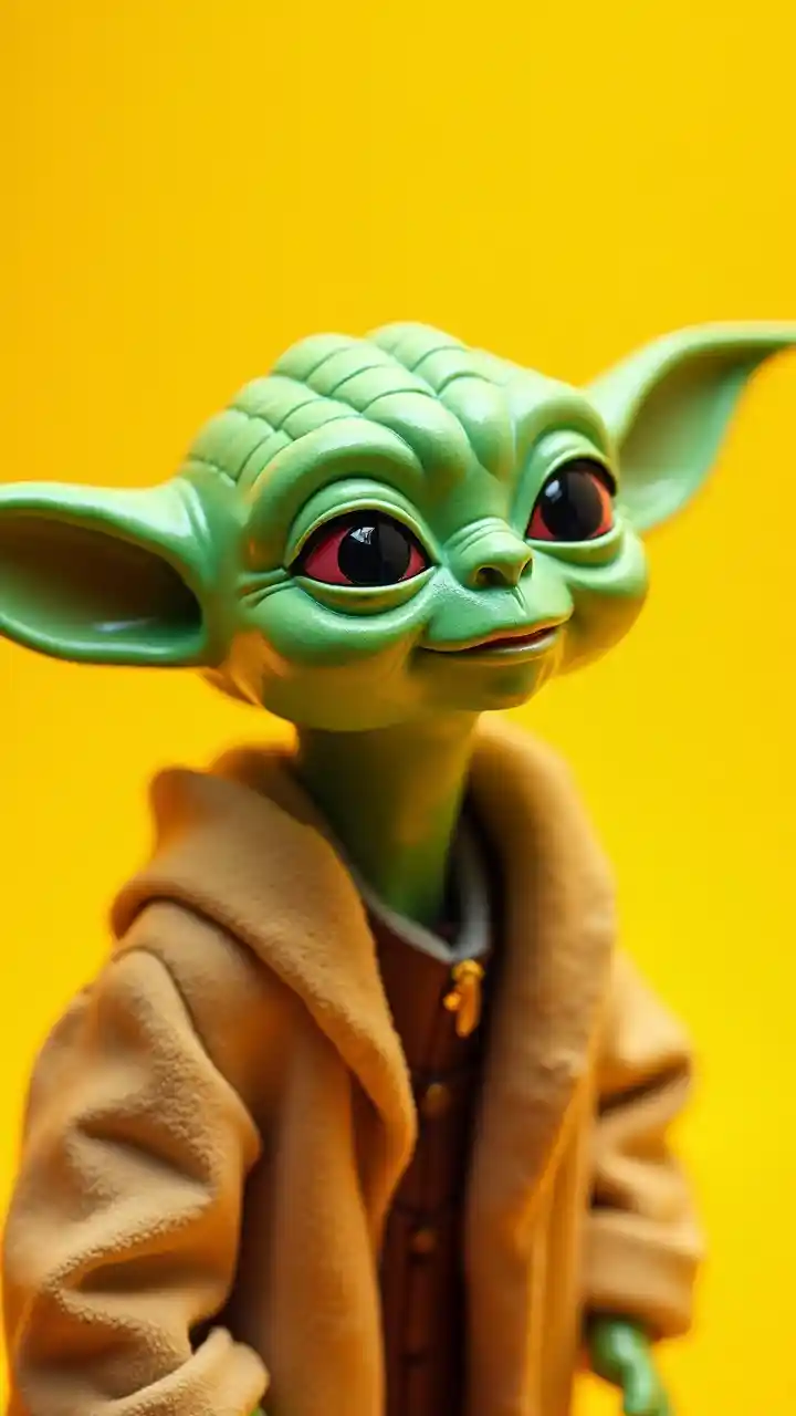 Das Bild besteht aus hellen farbigen Kunststoffmaterialien, Yoda, wie ein Spielzeug, heller gelber Hintergrund, helles Licht, helle und gesättigte Farben, lustig, hohe Details, Modemagazine, scharfer Fokus, helle Leistung, Schminktiefe, unglaublich hohe Details