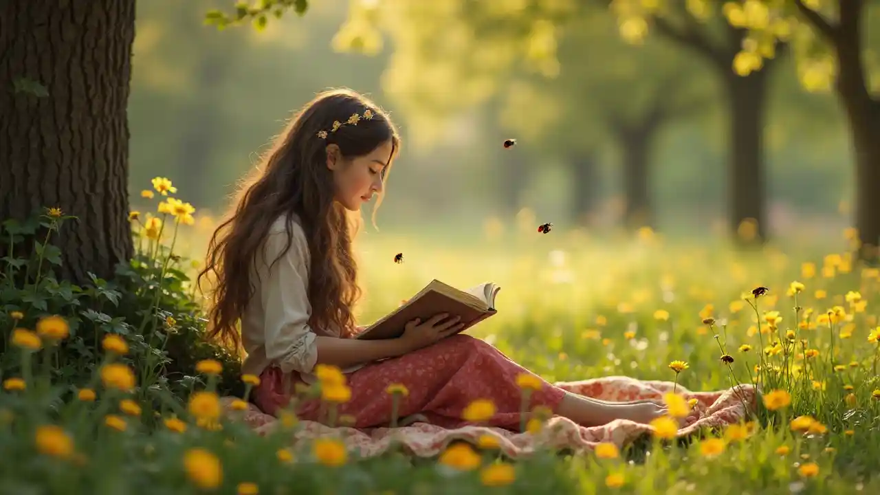 Die hübschen, langen, schwarzen Haare, die auf einer Decke unter einem Baum sitzen. Sie liest ein Buch. Die kleinen Damen und Käfer wachen auf und fangen an zu fliegen. An der Blüte, in der Luft, an ihr.