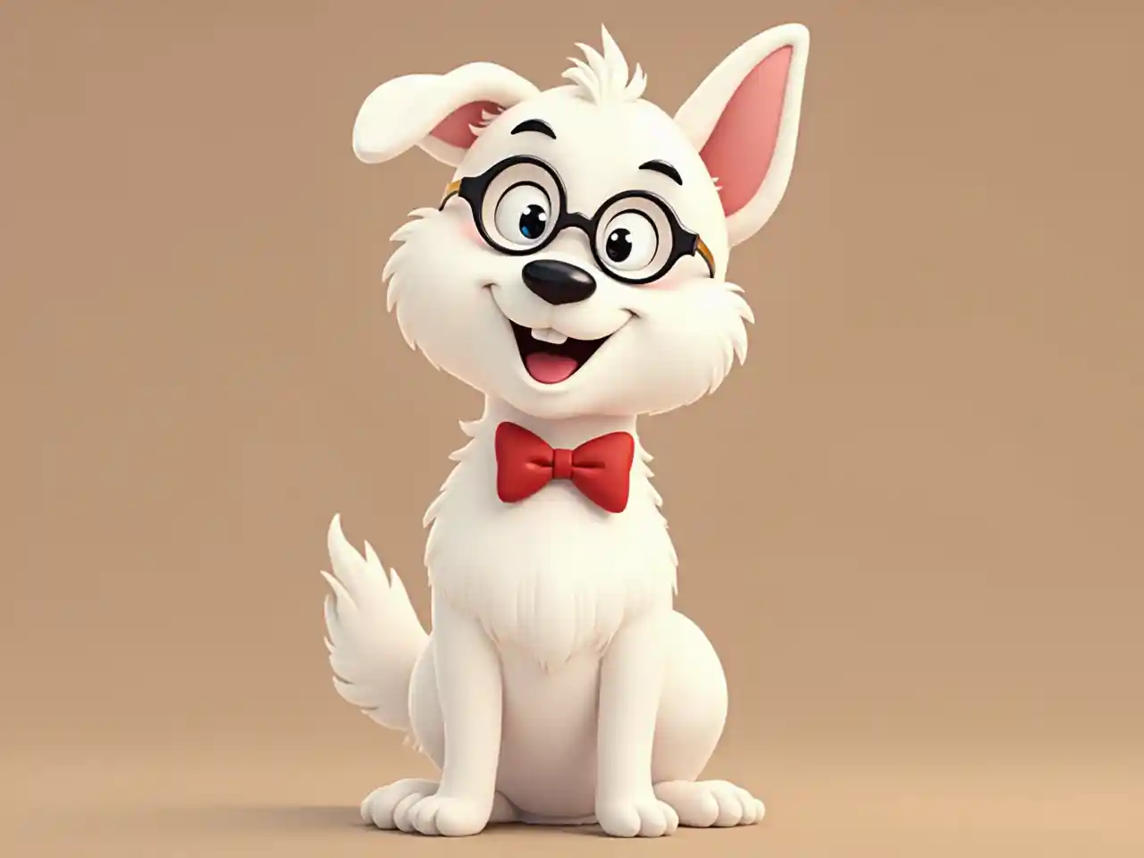 Ein weißer Cartoon-Hund mit Brille und Fliege
