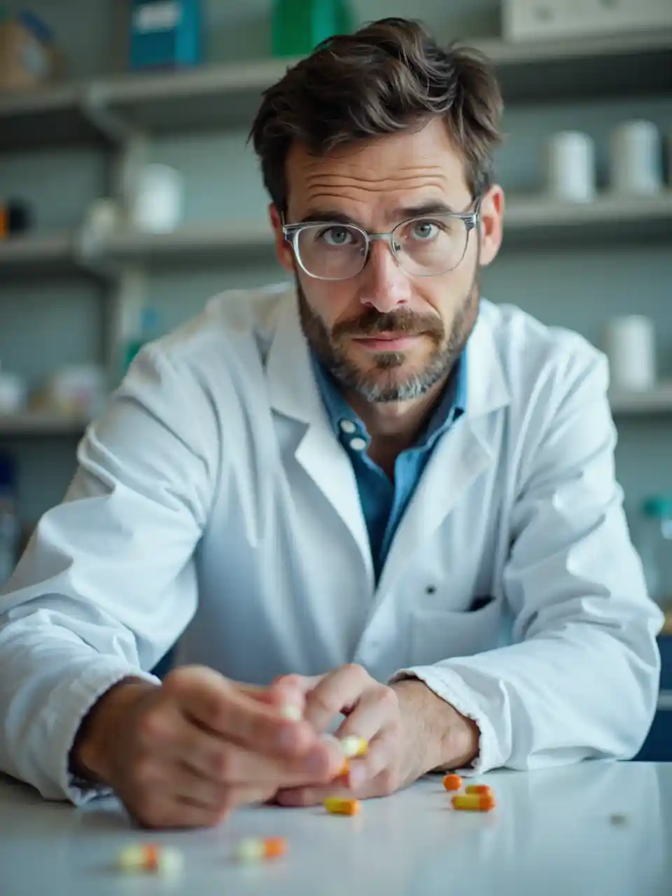 GraysonKasimir Fink im Labor, mit einigen Vitaminkapseln auf dem Tisch, blickt in die Kamera