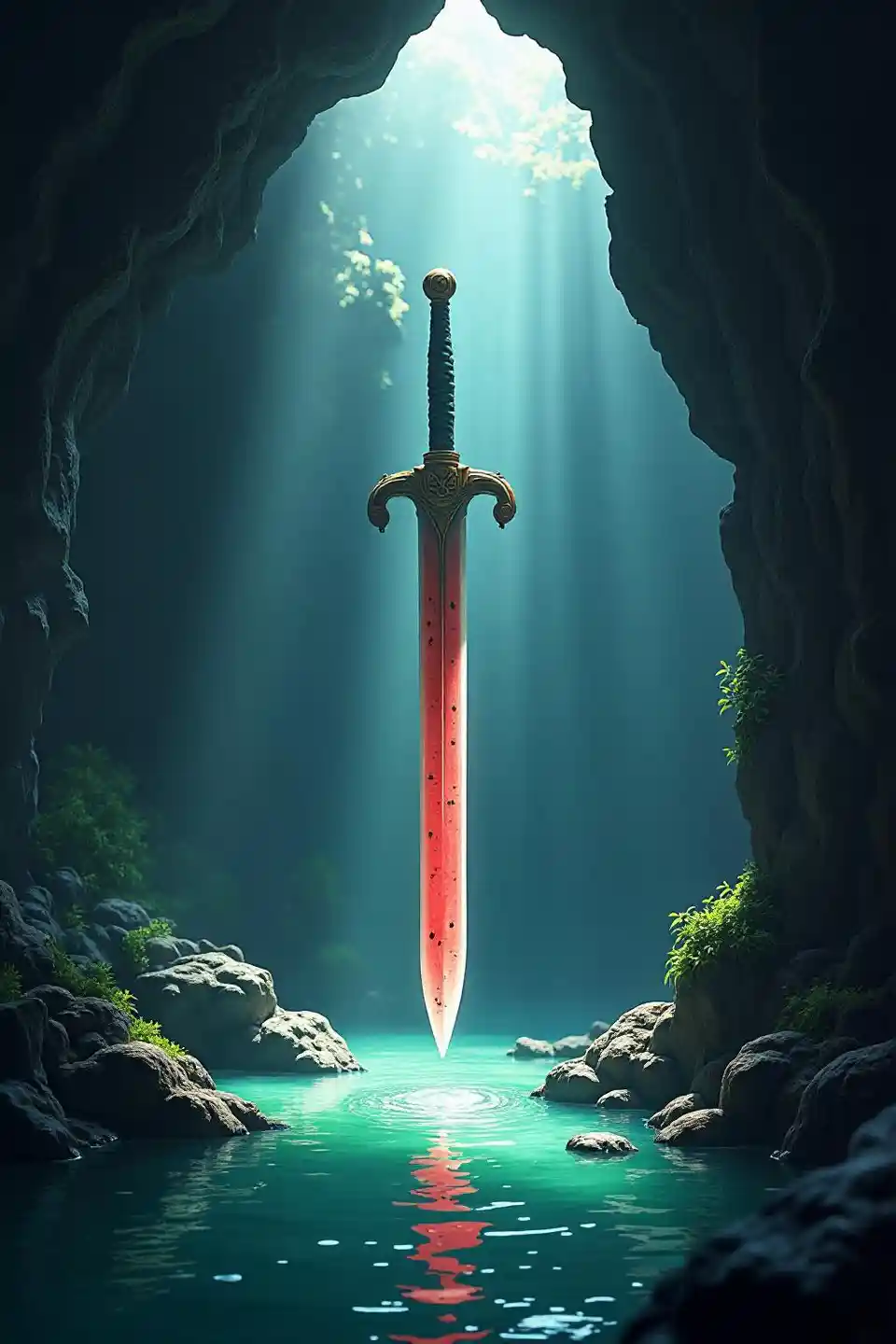 rubylynWassermelonen-Schwert auf dem Stein, Scheinwerfer von oben, im Loch, im flachen Wasser, glänzen