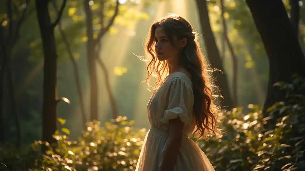 Magischer Wald, junger weiblicher Realismus, fließendes Haar, volle Figur, elegante Silhouette, zeitloses Outfit, ätherisches Licht, strahlende Aura, filmartige Kulisse, dramaturgische Träume, himmlische, himmelähnliche Essenz, erinnert an Elly Mays Stil, haptische Sehnsucht, ultrahohe Auflösung, Ultra-High-Definition, High-Definition, 8k, die Details sind exquisit und exquisit.