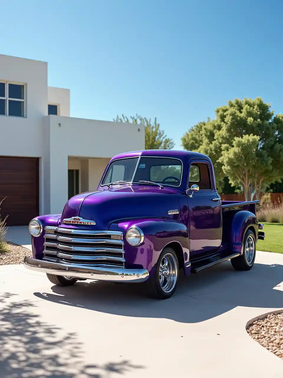In strahlendem Sonnenlicht getaucht, fällt ein auffälliger alter Chevrolet Truck mit seinem satten, glänzenden violetten Erscheinungsbild auf, das vor dem neutralen Hintergrund moderner Kontraste glänzt. Das klassische Design des Trucks zeichnet sich durch glatte Linien und abgerundete Kanten aus, und der glänzende Chromgrill unterstreicht das „Chevrolet" -Logo und verstärkt seinen Retro-Charme. Diese Szene befindet sich auf einer sauberen, gepflasterten Einfahrt, umgeben von einer minimalistischen Landschaft, die die harmonische Verschmelzung von nostalgischem Autohandwerk und zeitgenössischer Architektur einfängt. Der knackig blaue Himmel über dem Kopf deutet auf einen warmen, sonnigen Tag hin und unterstreicht die gewagten Farben und polierten Details des Lkw. Die Gesamtstimmung vermittelt Stolz und Bewunderung für die Fahrzeuggeschichte und ihre modische Präsenz in modernen Kontexten.