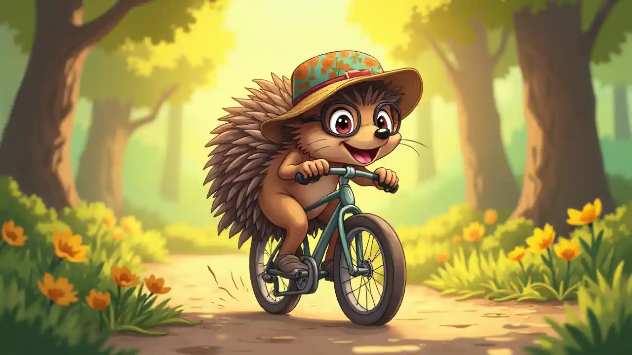 Ein trendiger Cartoon-Igel, der morgens mit dem Fahrrad durch einen strahlenden Sommerwald fährt. Der Igel trägt eine Blumenmütze und eine schwarze Hipster-Brille, wirkt modisch und leicht arrogant. Die Sonne strahlt lebendig durch die Bäume und wirft gesprenkelte Schatten. Der Stil ist Cartoon-realistisch, die Farben sind akribisch und ausdrucksstark.